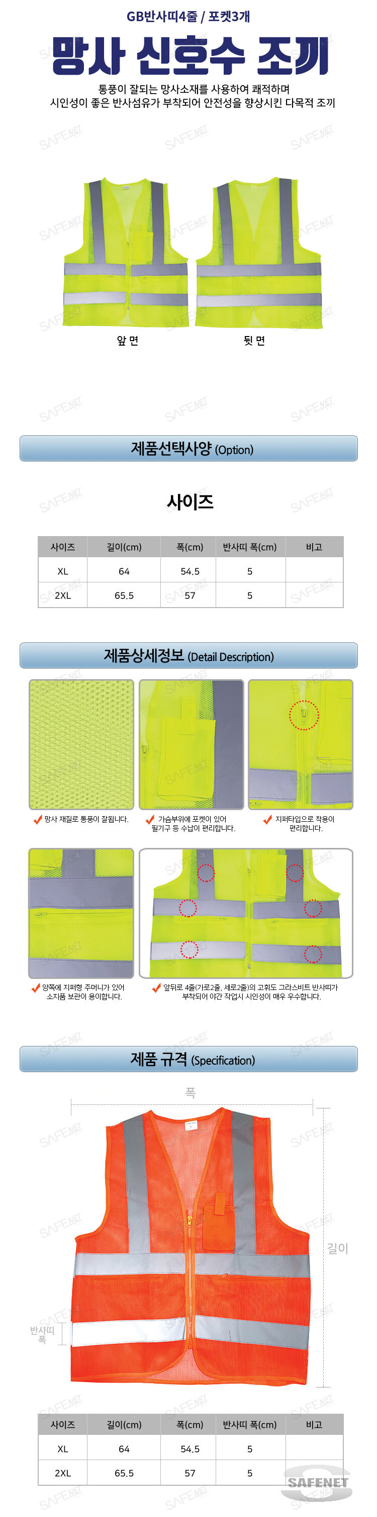 규격 형광색 / 망사원단 / GB(그라스비드)반사띠 4줄 / 다용도포켓3개