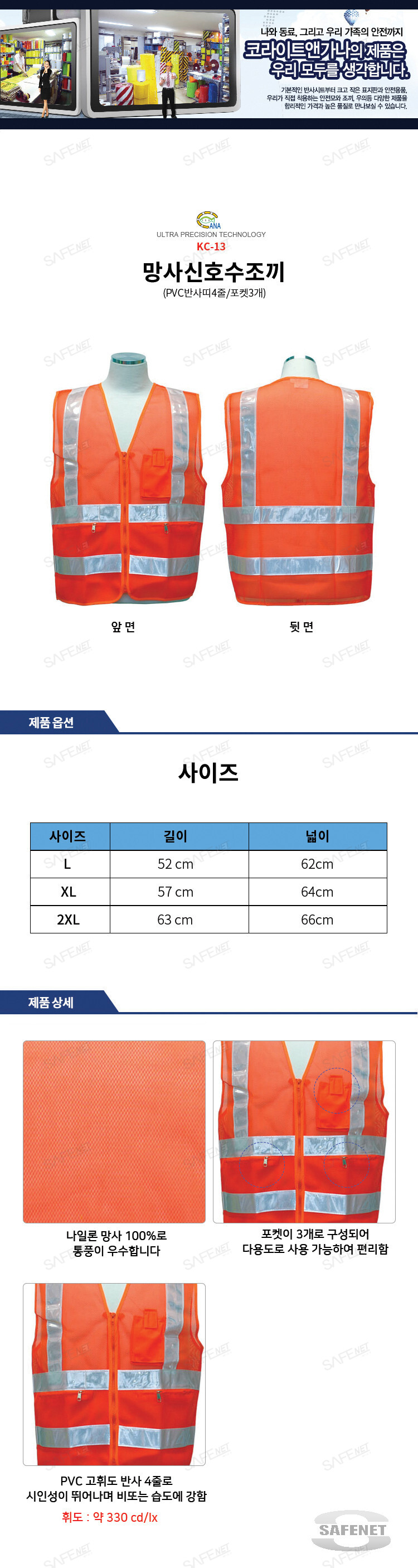 주황색 망사신호수조끼 KC-13 (PVC반사띠4줄/포켓3개)
