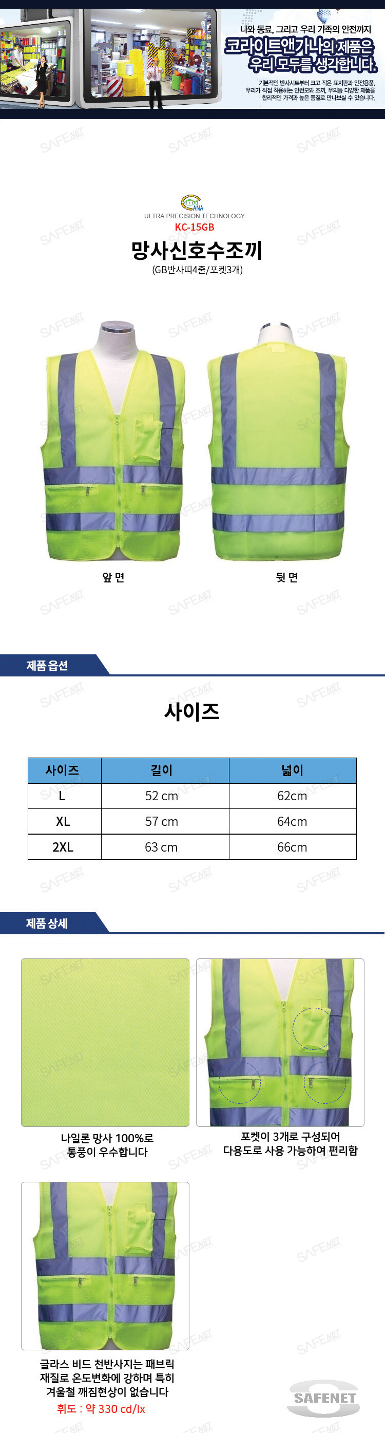 형광색 망사신호수조끼 KC-15GB (GB반사띠4줄/포켓3개)