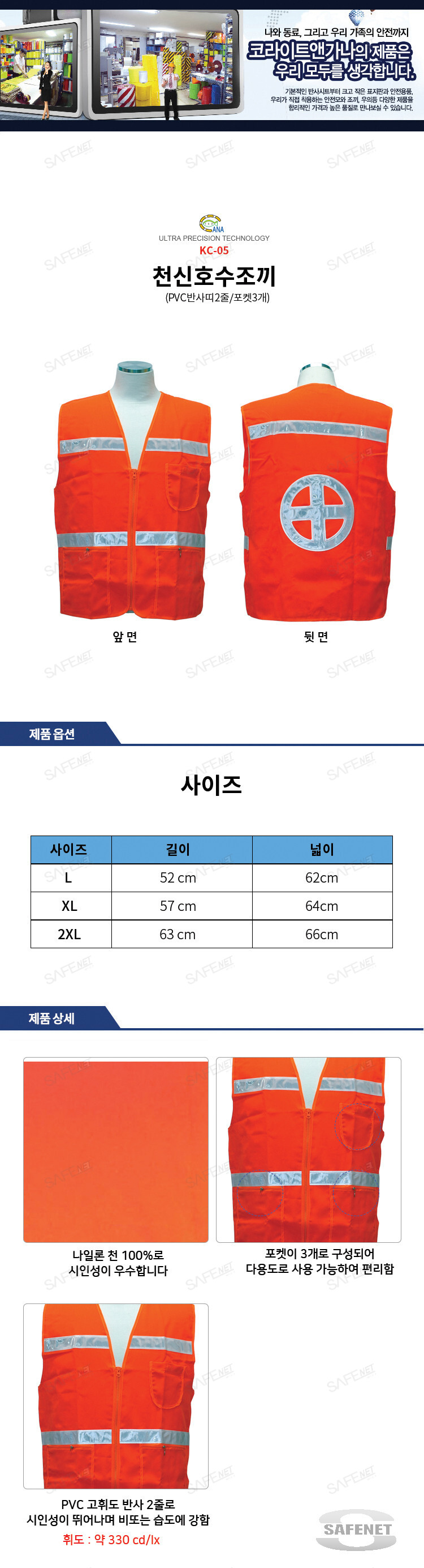주황색 천신호수조끼 KC-05 (PVC반사띠2줄/포켓3개)