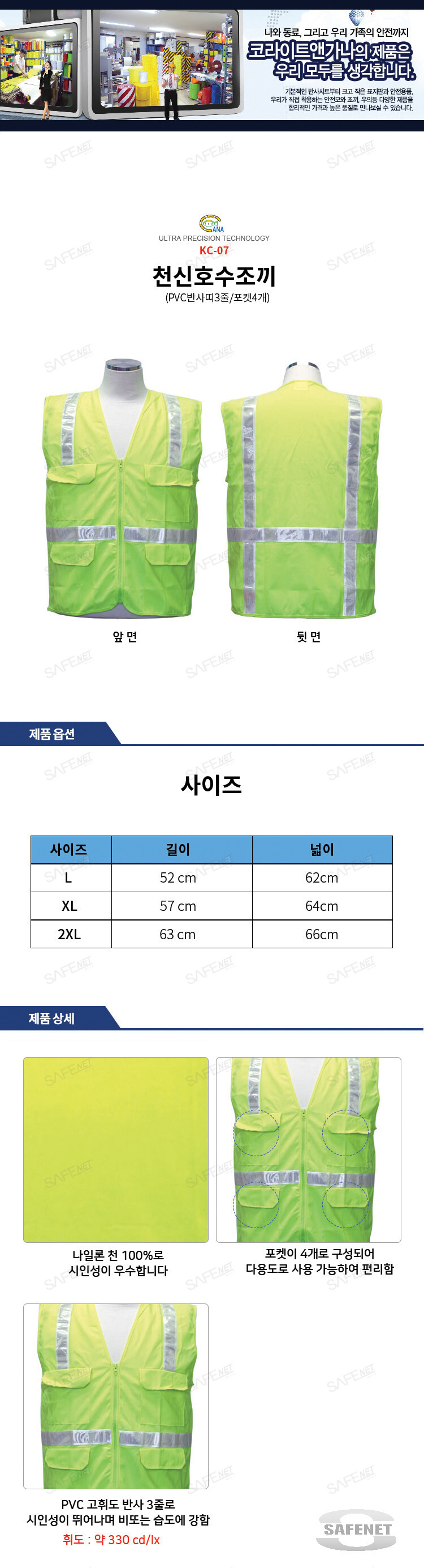 형광색 천신호수조끼 KC-07 (PVC반사띠3줄/포켓4개)