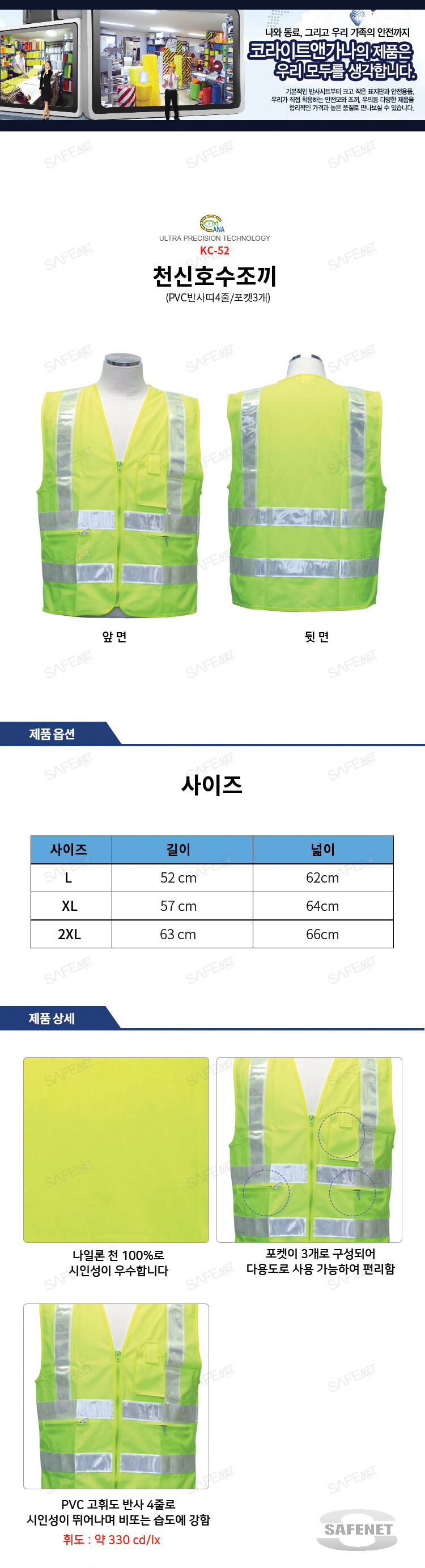 형광색 천신호수조끼 KC-52 (PVC반사띠4줄/포켓3개)