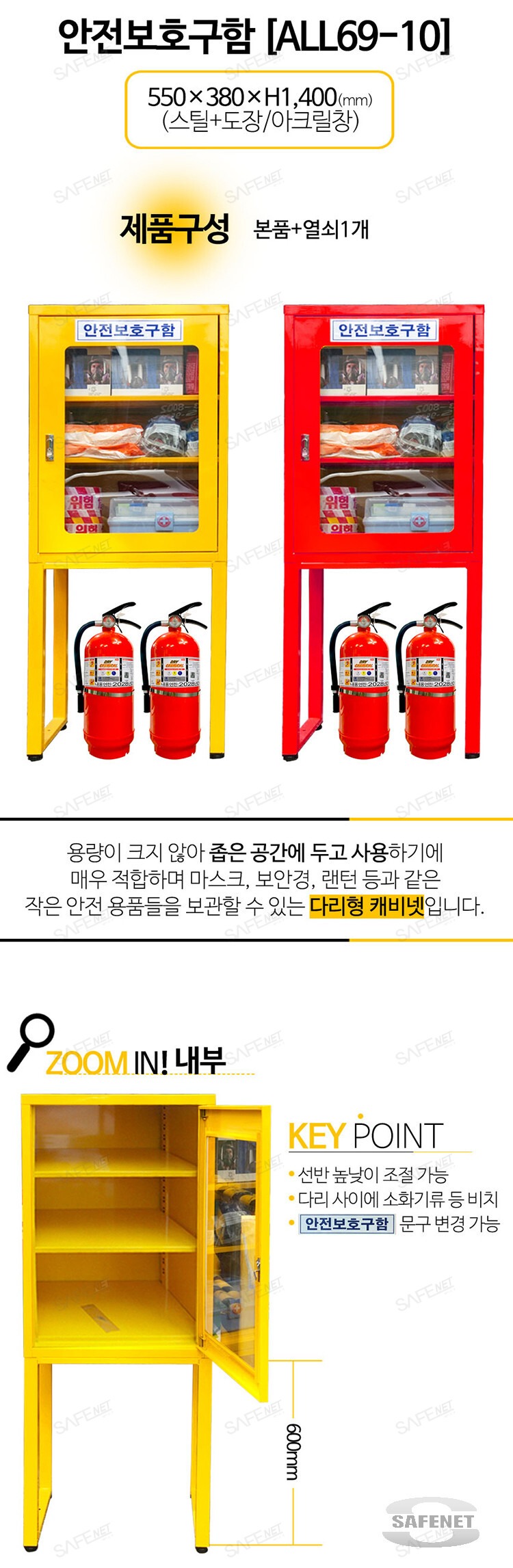 마스크, 보안경, 랜턴 등과 같은 작은 안전 용품들을 보관할 수 있는 다리형 캐비넷입니다.