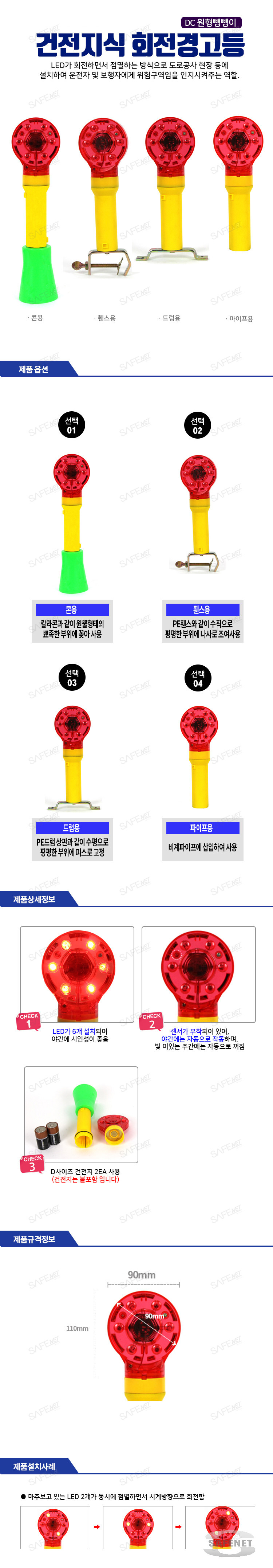 규격 1.5V D형건전지 2개 사용 / LED가 회전점멸 방식으로 작동 / LED 6개