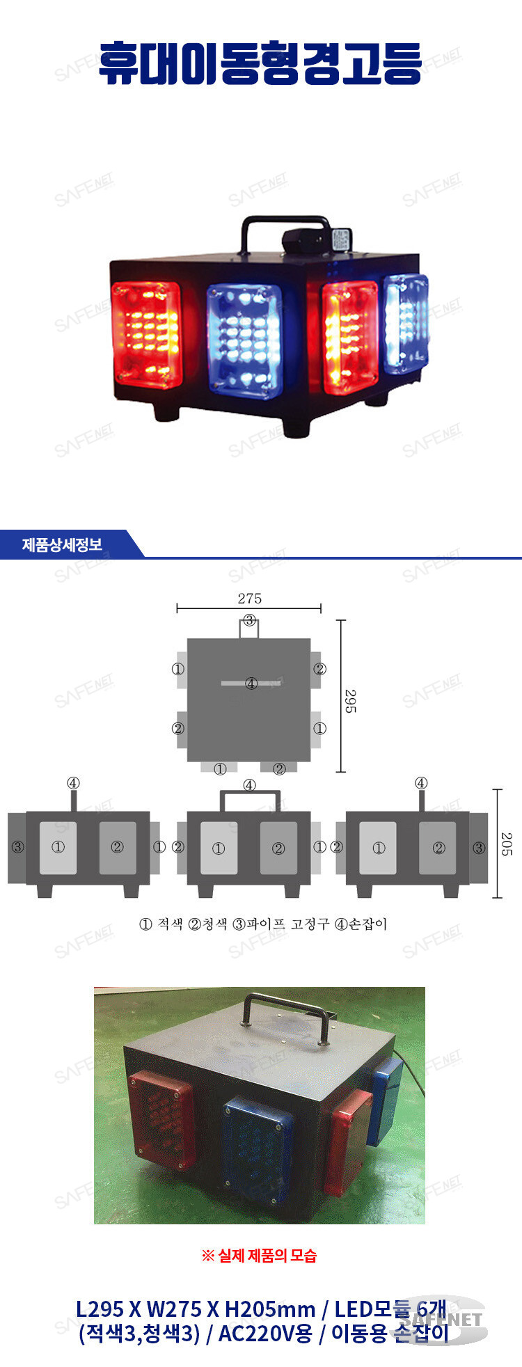 규격 L295 X W275 X H205mm / LED모듈 6개 (적색3,청색3) / AC220V용 / 이동용 손잡이