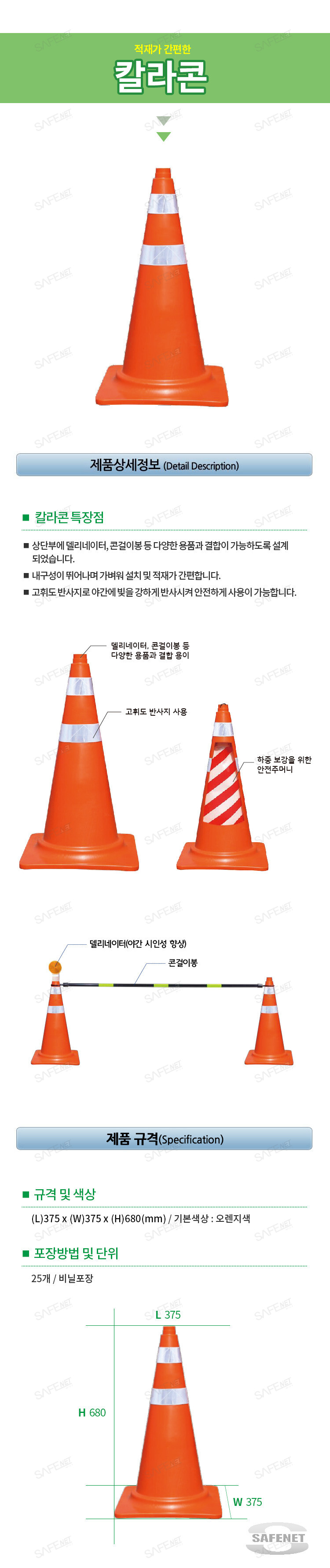 규격 L375 X W375 X H680 / PE재질 / 반사띠2줄 / 오렌지색