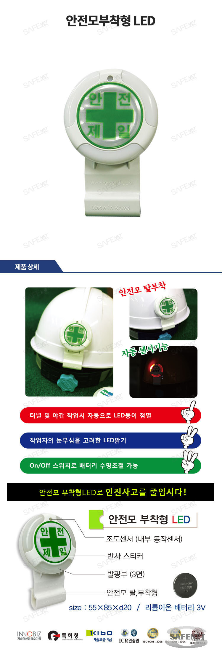 규격 55*85*D20 mm / 안전모 탈부착형 / 리튬이온 배터리 3V