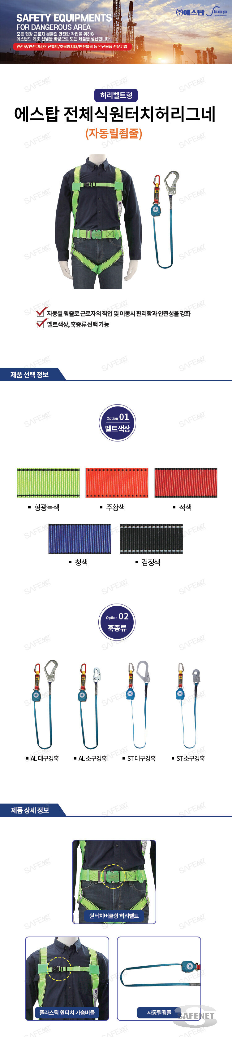 규격 원터치허리벨트 / 자동릴죔줄 / 플라스틱 원터치 가슴버클 / 벨트색상 선택가능 / 훅종류 선택가능