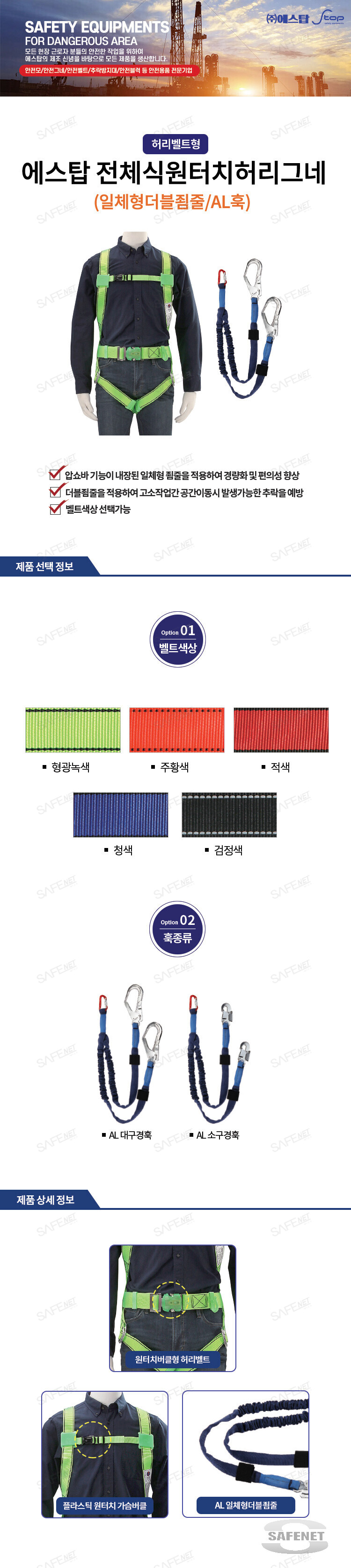 규격 원터치허리벨트 / 일체형더블죔줄 / AL훅 / 플라스틱 원터치 가슴버클 / 벨트색상 선택가능 / 훅종류 선택가능