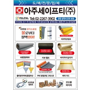 오토스보안경, 애니가드 방진마스크, 안전그네, 안전장갑, 코팅포, 표지판, 저장소, 안전교육장, 안전모, 조끼 인쇄, 이탈방지망, 이동식BT비계, 각종 안전용품