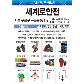 안전모, 조끼 인쇄/제작전문, 웨빙띠, 네파/프로스펙스 안전화, 쎄다 안전모/안전대, 3M 보안경/마스크. 유한킴벌리 보호복, 도로안전용품