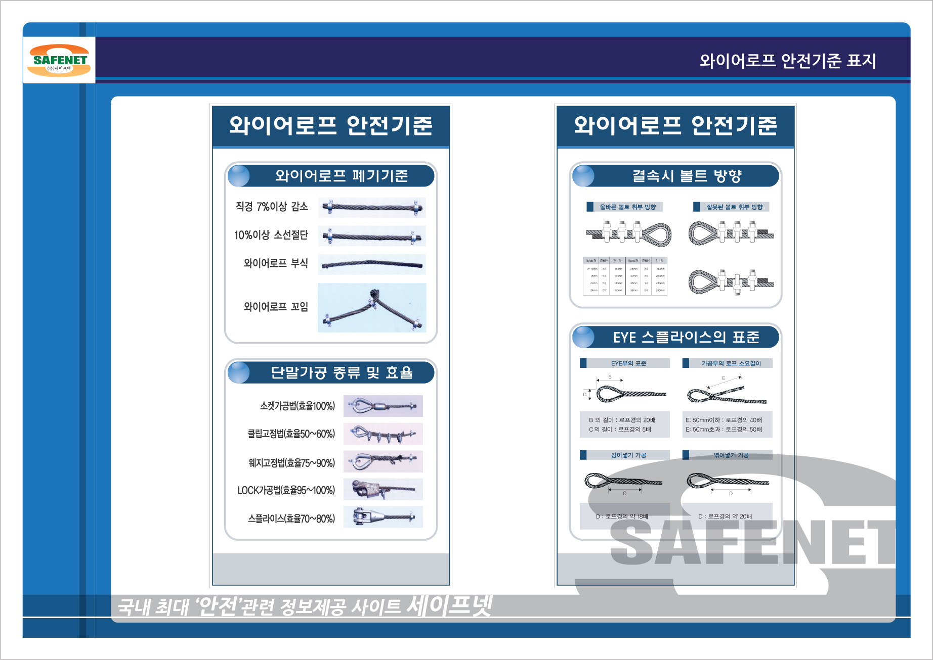 와이어로프 폐기기준/와이어로프 결속시 볼트 방향/단말가공 종류 및 효율/EYE 스플라이스의 표준