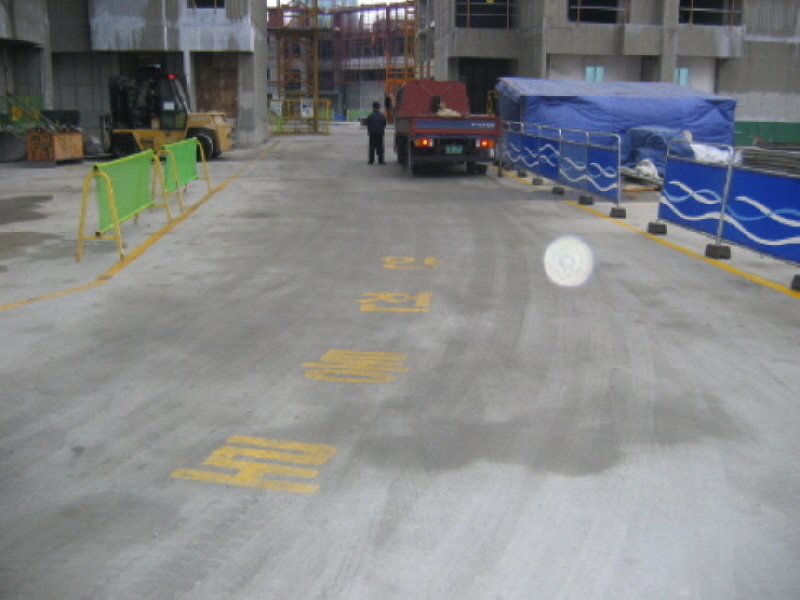 현장 바닥에 페인트로 안전통로를 표시한 사례