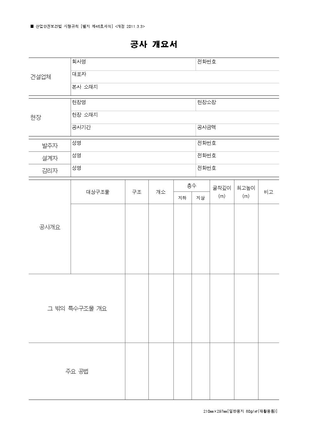 공사개요서(산안법시행규칙_별지 제45호 서식)