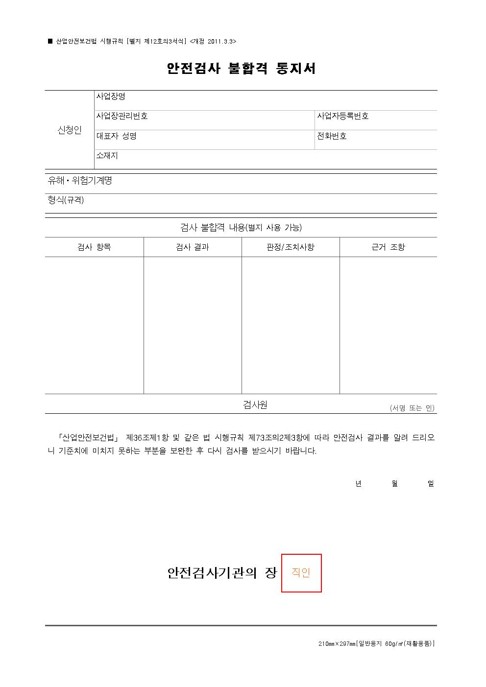 안전검사 불합격통지서(산안법시행규칙_별지 제12호의3 서식)