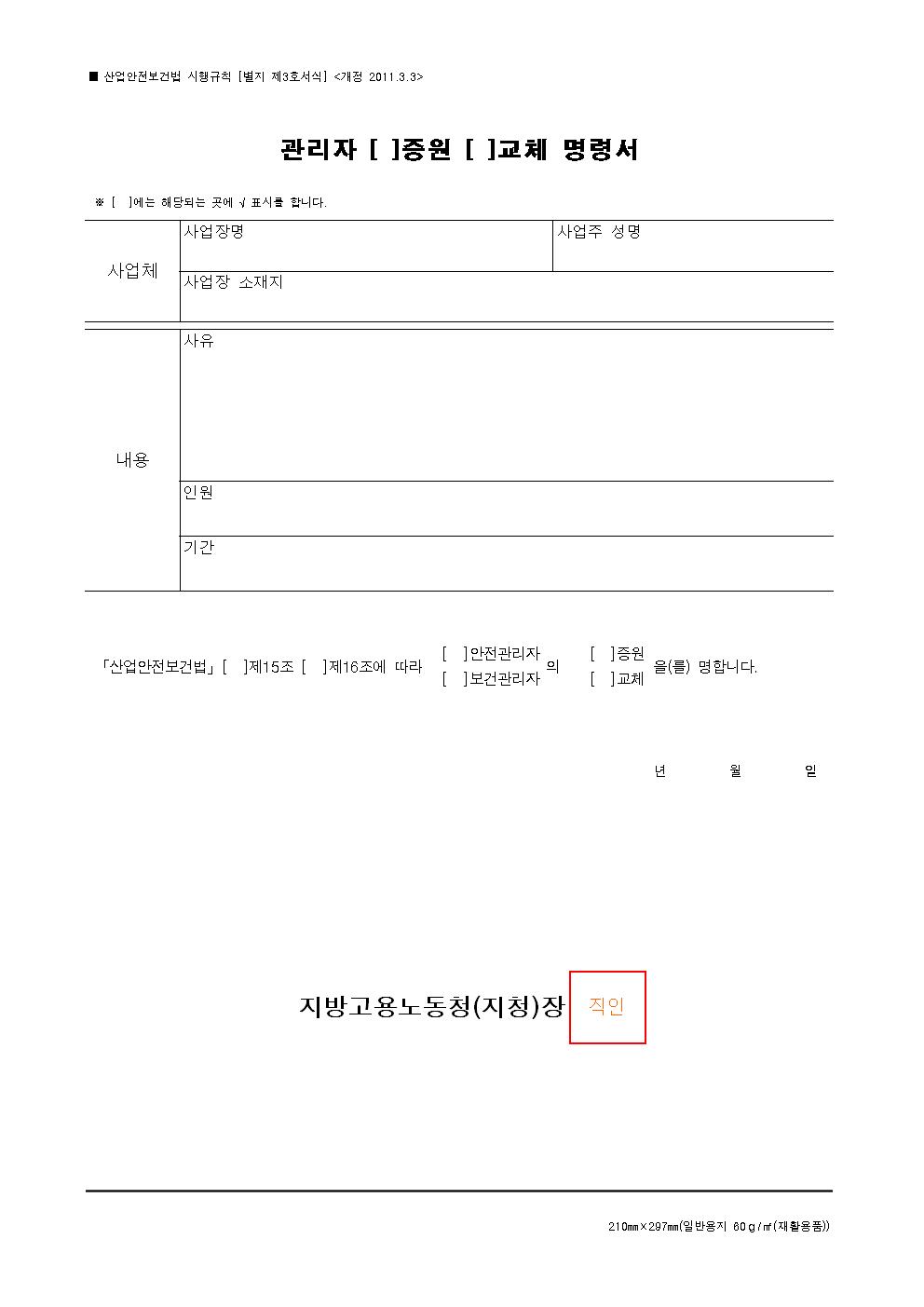 관리자(증원.교체)명령서(산안법시행규칙_별지 제3호 서식)