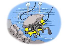 바지선 상부에서 B/H(굴삭기)를 이용하여 수심 5m 깊이에 피복석을 내리던중 인양용 달기체인 (φ9mm) 에서 피복석 (크기 : 0.5m X 0.7m X 0.7m, 중량:600kg)이 이탈되면서 수중에서 작업중이던 피재자의 두부를 강타, 사망한 재해임