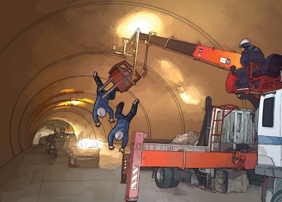 정 씨와 신 씨는 상부조립조로 크레인 버킷(크레인 등의 끝에 달린 양동이같이 생긴 것)에 탑승해서 천장에 하수강을 설치하는 업무를 담당하고 있다.