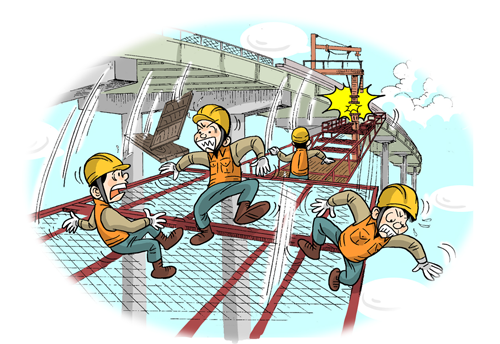 이동형 작업대차를 이용하여 교량 슬라브 거푸집 해체작업을 하던중 작업대차의 상 · 하부 연결지주의 볼트가 뽑히면서 하부작업대가 도괴되어 떨어졌고, 작업자 4명이 작업대와 함께 떨어져 2명 사망, 2명 부상당한 재해임