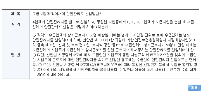 ○ 각각의 수급업체의 상시근로자가 50명 이상일 때에는 별개의 사업장 단위로 보아 수급업체는 별도의 안전관리자를 선임하여야 하며, 산안법 제18조제1항 규정에 의한 안전보건총괄책임자 지정대상사업(제1차 금속 제조업, 선박 및 보트 건조업, 토사석 광업 등)으로 수급업체의 상시근로자가 50명 미만일 때에는 도급업체의 사업주가 수급업체의 상시근로자를 합한 근로자수에 해당하는 안전관리자를 선임하여야 함. ○ 다만, 산안법 시행령제12조에 따라 도급인인 사업주가 동법 시행규칙 제15조의2 요건을 갖추어 수급인인 사업주의 근로자에 대한 안전관리자를 추가로 선임한 경우에는 수급인의 안전관리자 선임의무는 면제됨. ○ 또한, 산안법 시행령 제12조제4항(특조법제36조)에 따라 동일한 산업단지 등에서 사업을 영위할 경우 3개소 이하의 사업장에서 안전관리자를 공동채용할 수 있으나 이들이 상시 사용하는 근로자 수의 합계는 300명 이내이어야 함.