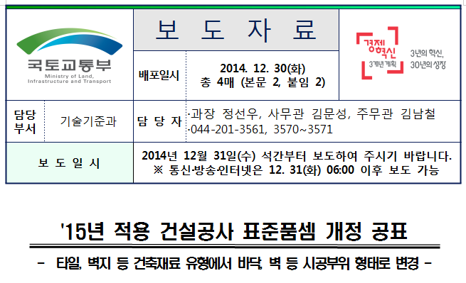 국토교통부(장관 서승환)는 '15년 1월 1일부터 건설공사 표준품셈을 일부 개정하여 시행한다고 밝혔다.
