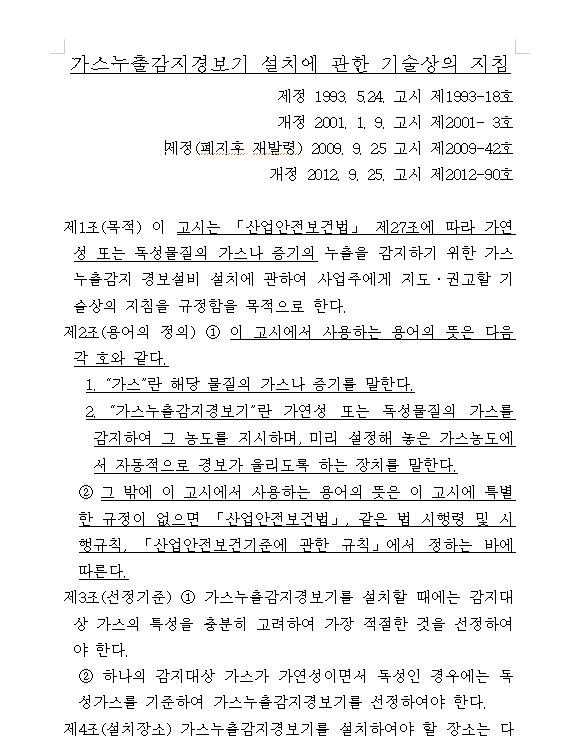 [고용노동부고시 제2012-90호] 가스누출감지경보기 설치에 관한 기술상의 지침-2012.9.25 개정