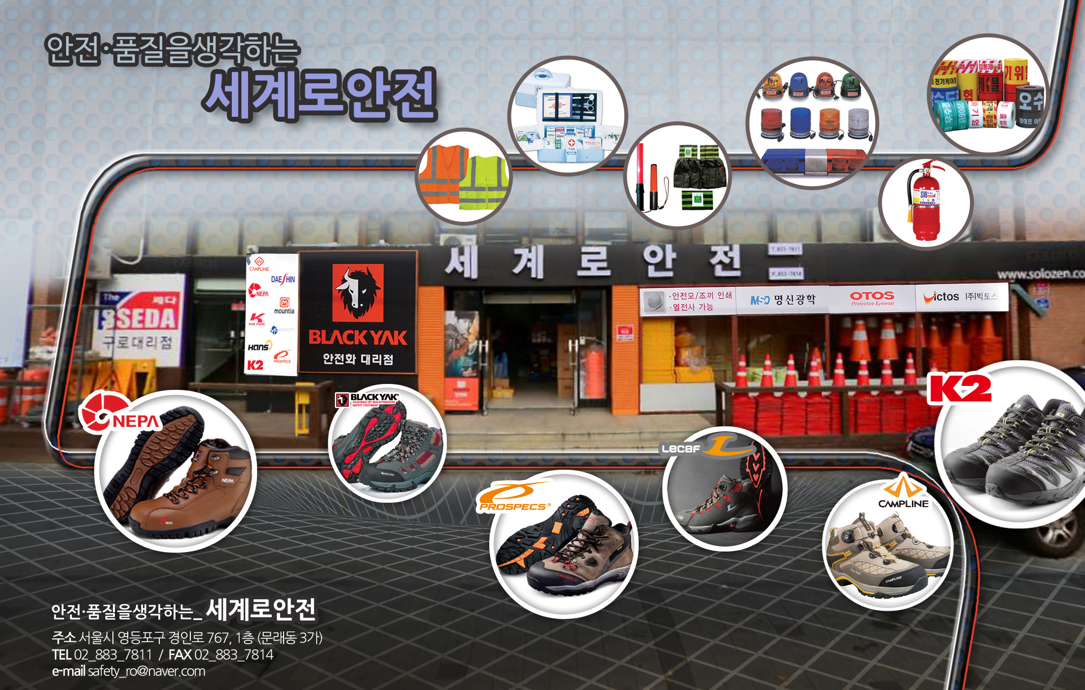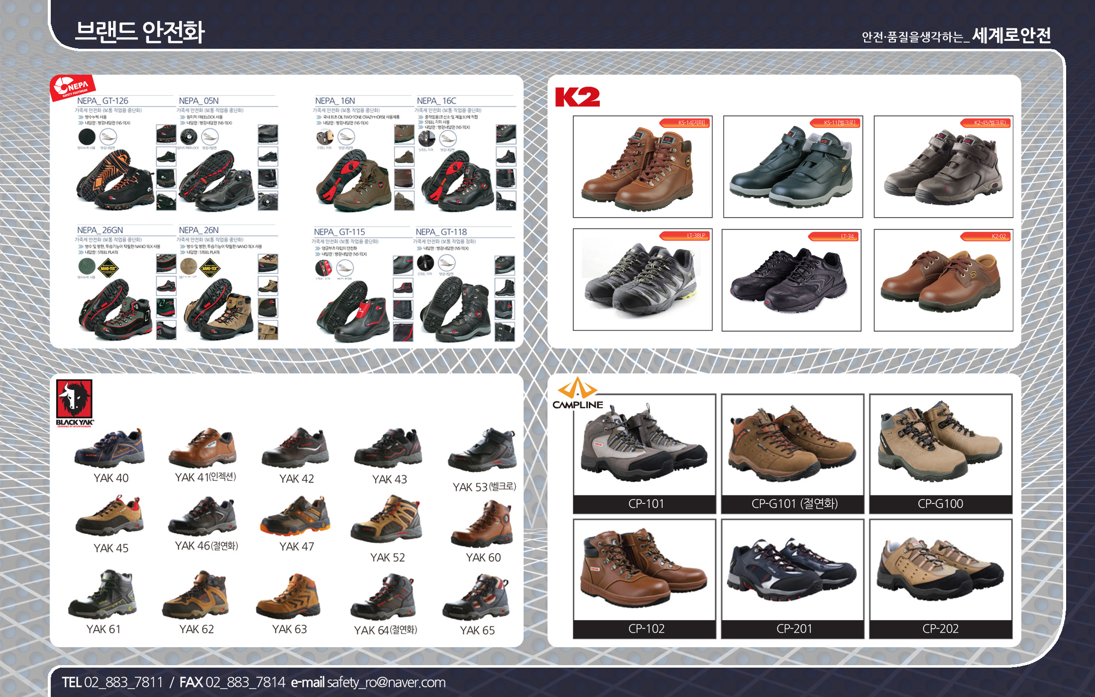 * 안전화 : K2안전화, 네파안전화, 블랙야크안전화, 프로스펙스안전화, 르까프안전화, 캠프라인안전화. 프로월드컵안전화,
