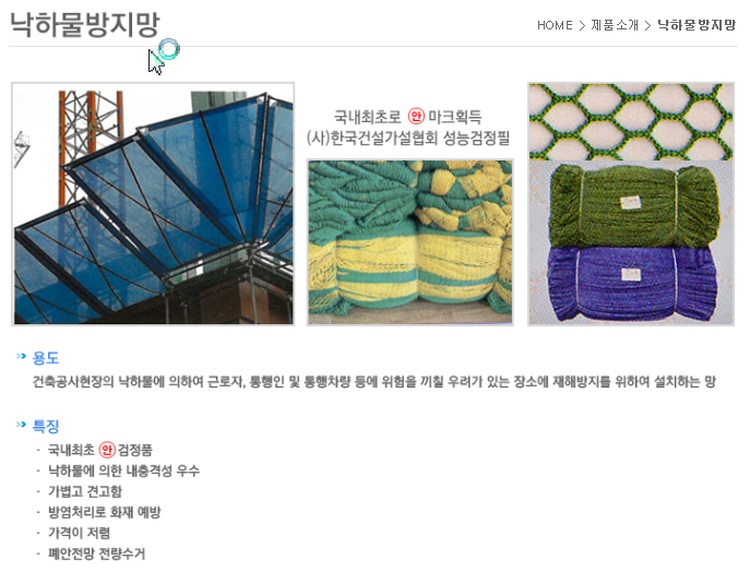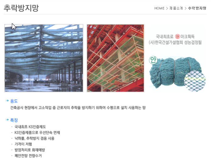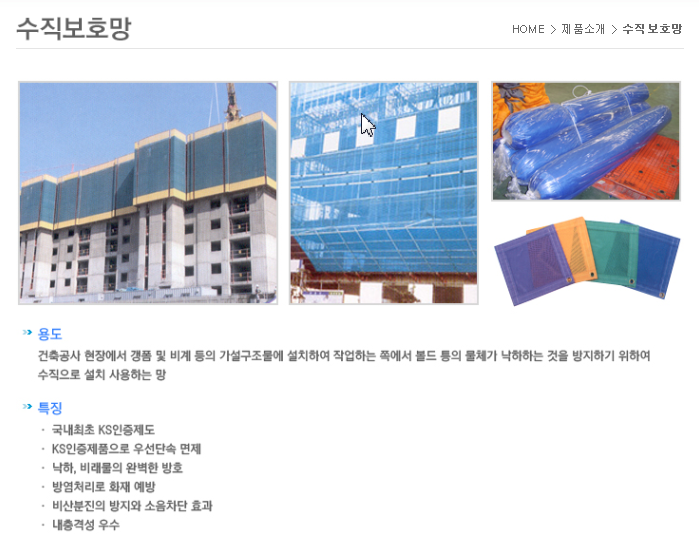 주요취급품목 : 추락방지망. 낙하물방지망. 수직보호망. 러셀망. 휘장망. 분진망. pp로프 등