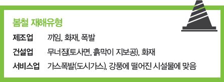 춘곤증으로 인한 감김이나 끼임 재해뿐만 아니라 제조업에서는 화재와 폭발, 건설현장에서는 지반의 가라앉음으로 인해 무너짐 재해가 발생할 수 있으므로 이에 대한 안전관리대책을 세우는 것이 중요하다.