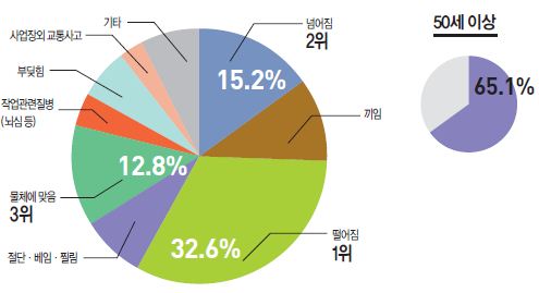 건설업의 주요 발생 유형은 떨어짐(32.6%), 넘어짐(15.2%), 물체에 맞음(12.8%) 순이었고, 건축건설공사(62.8%), 기타건설공사(33.5%), 기계장치공사(1.8%) 중심으로 50세 이상 장년근로자의 재해가 65.1%를 차지하고 있다.