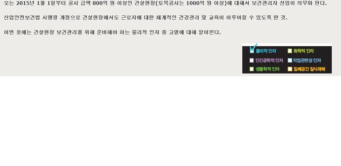 이번 호에는 건설현장 보건관리를 위해 준비해야 하는 물리적 인자 중 고열에 대해 알아본다.