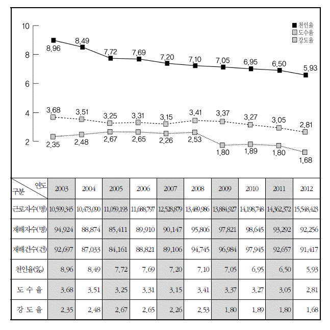 ◦ 천인율은 5.93‰로 2011년도의 6.50‰에 비하여 0.57‰포인트가 감소하였다.