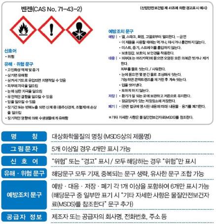 MSDS 와 GHS란?의약품을 구입하면 그 성분 및 함량과 효능, 부작용 등을 알려주는 설명서가 함께 있듯이 사업장에서 취급·사용하는 화학물질의 경우에도 안전한 사용을 위한 유해·위험정보 자료가 함께 제공되는데 이것이 물질안전보건자료(Material Safety Data Sheet, MSDS)이다.산업안전보건법 제41조에 의거, 사업주는 화학물질 또는 제품의 MSDS를 취급자 또는 근로자가 쉽게 볼 수 있는 장소에 비치해야하는 의무가 있다.GHS(Globally Harmonized System of chemical classification and labeling)는 화학물질의 유해성과 심각성을 그림과 유해·위험문구 등으로 화학제품에 표시하는 UN이 정한 국제기준에 따른 유독물 분류표시 제도다. 화학물질 저장용기의 위험성 분류 및 표지에 관한 국제표준기준으로 세계적으로 통일된 유해성 정보전달시스템을 확립하기 위한 제도다.