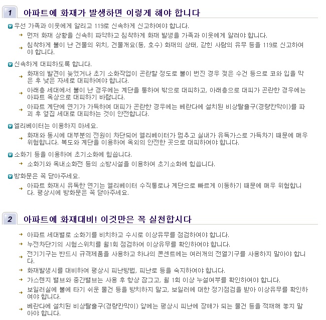 - 아래층 세대에서 불이 난 경우에는 계단을 통하여 밖으로 대피하고, 아래층으로 대피가 곤란한 경우에는 아파트 옥상으로 대피하기 바랍니다.