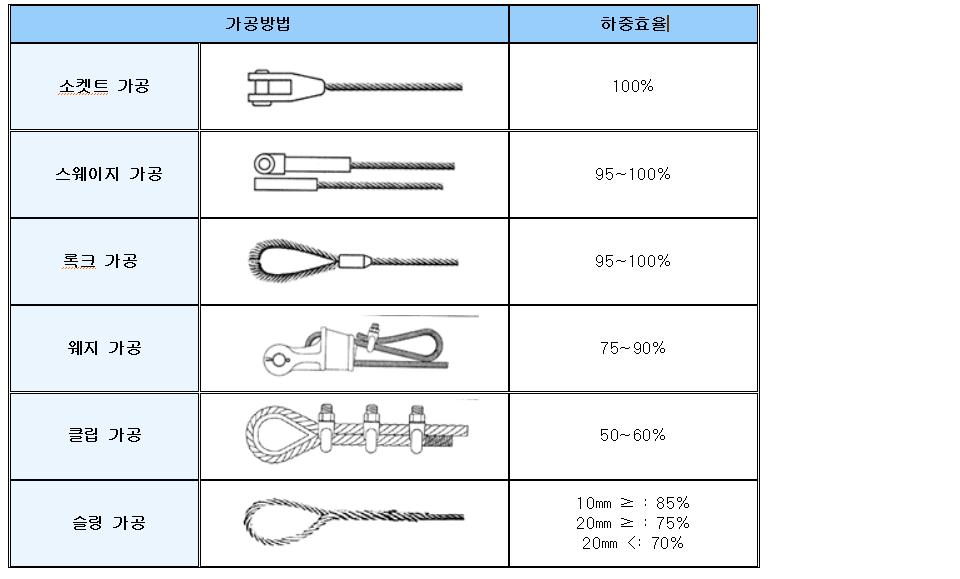 따라서 단말가공은 로프와 마찬가지로 안전과 위험을 동일하게 취급해야 하며 반복사용에 의한 피로의 가공방법에 따른 효율 등을 면밀히 검토해야 한다.
