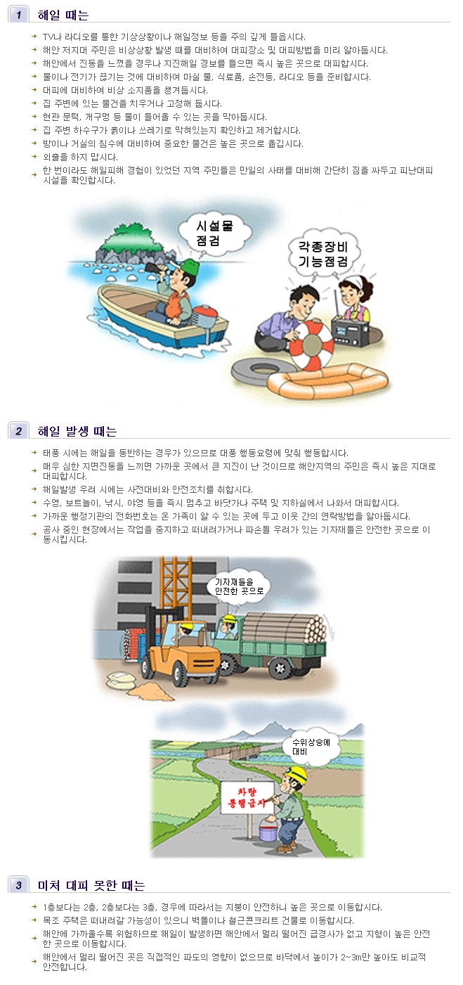 TV나 라디오를 통한 기상상황이나 해일정보 등을 주의 깊게 들읍시다.