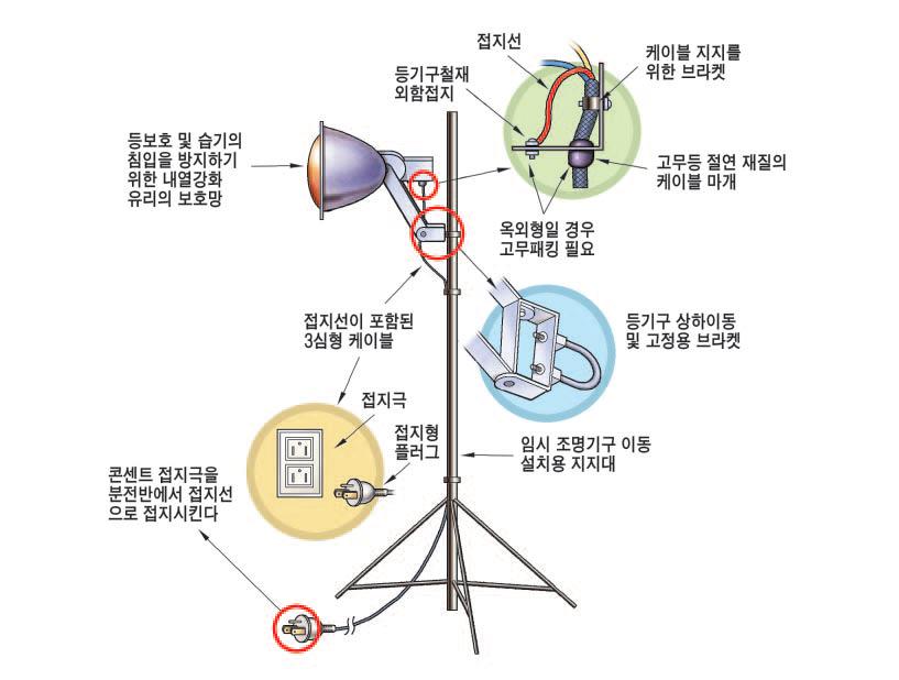 - 사업주는 이동전선에 접속하여 임시로 사용하는 전등이나 가설의 배선또는 이동전선에 접속하는 가공매달기식 전등등을 접촉함으로 인한감전 및 전구의 파손에 의한 위험을 방지하기 위하여 보호망을 부착하여야 한다.