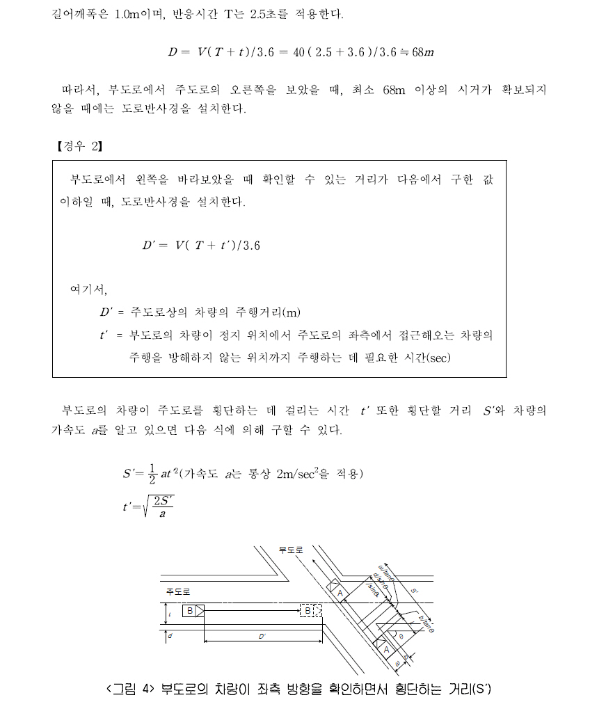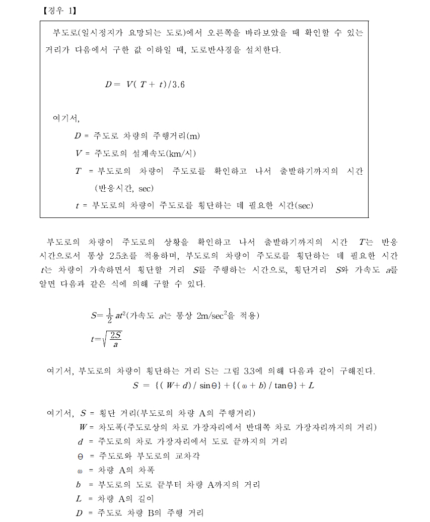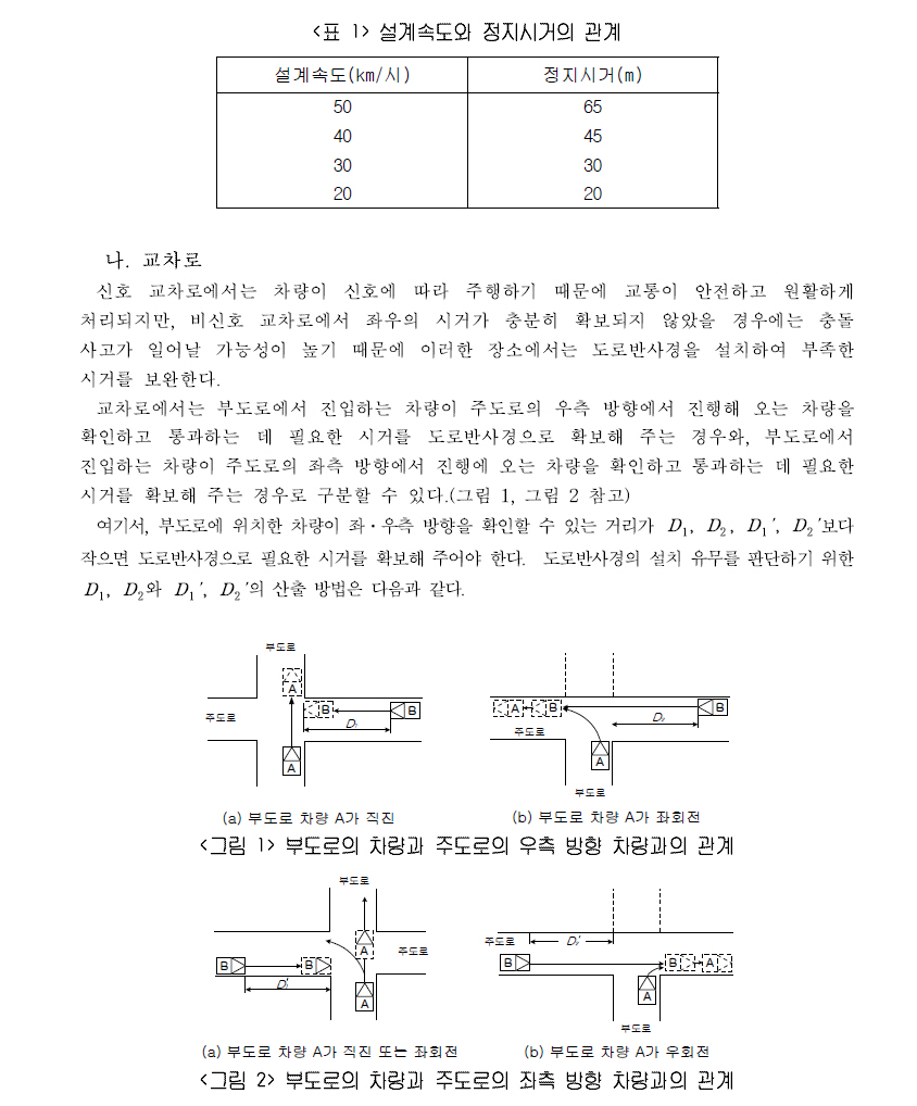 본 지침에서도 주행속도와 설계속도가 동일한 것으로 간주하여 반사경의 설치 여부를