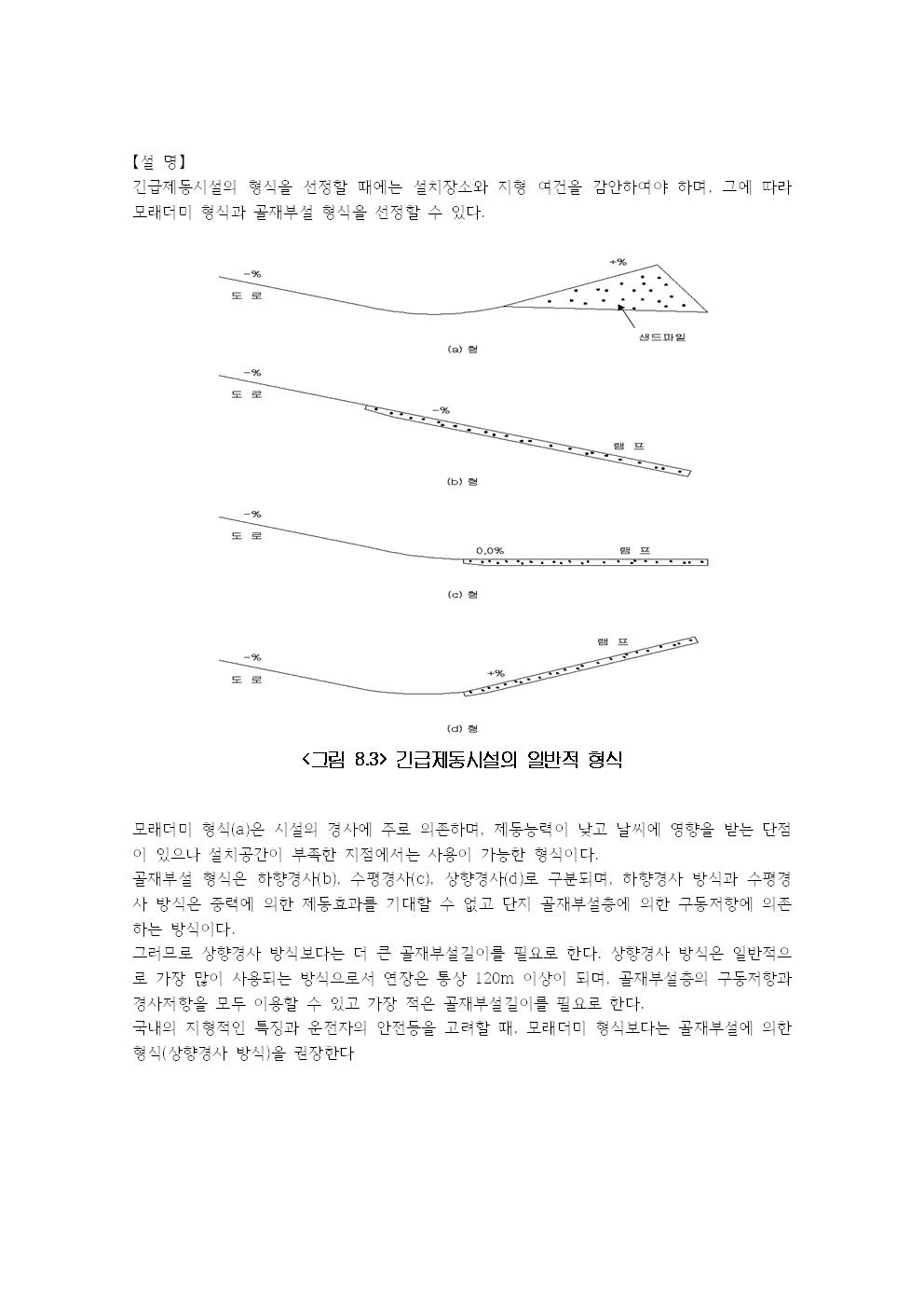 국내의 지형적인 특징과 운전자의 안전등을 고려할 때, 모래더미 형식보다는 골재부설에 의한 형식(상향경사 방식)을 권장한다