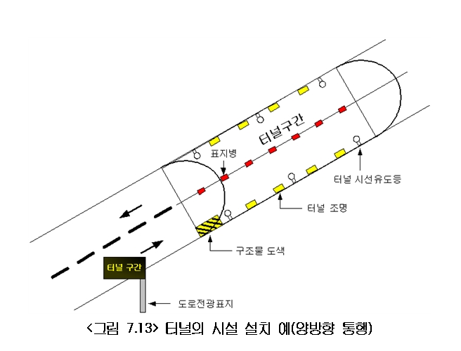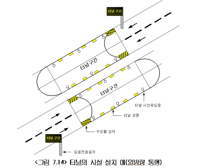 터널 및 터널 전․후의 접속도로에는 운전자가 노면상의 장애물 등을 쉽게 발견하고 사고의 위험으로부터 벗어나기 위하여 충분한 시각 인지성을 제공하도록 조명을 설치한다.