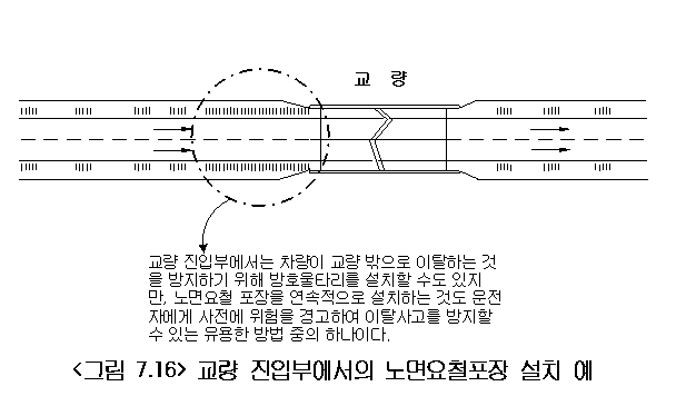 교량 진입부에서 차량이 교량 밖으로 이탈하는 것을 방지하기 위해 사전에 소음 및 진동을 통해 위험을 경고할 수 있는 노면요철포장을 설치할 수 있다