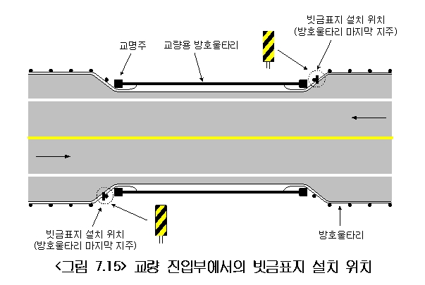 교량에 진입한 운전자들이 도로환경의 변화를 인식시켜 교통의 원활함을 확보하고 사고의 예방 및 도로의 선형 및 길 가장자리에 대한 시선유도를 위해 시선유도표지를 설치한다.