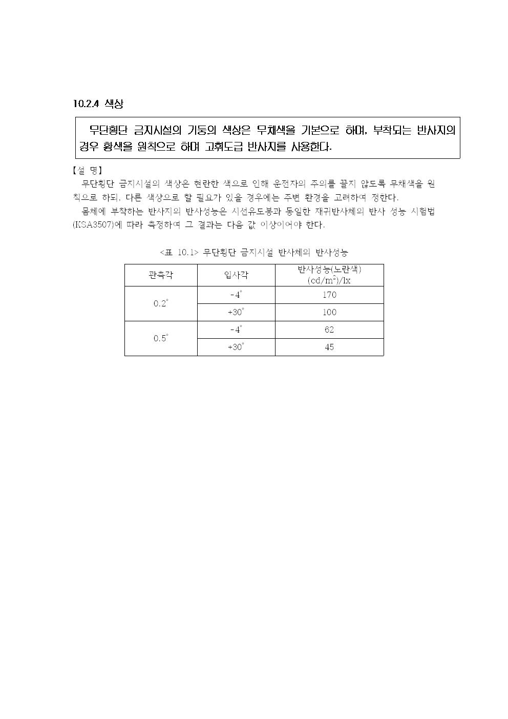 무단횡단 금지시설의 색상은 현란한 색으로 인해 운전자의 주의를 끌지 않도록 무채색을 원칙으로 하되, 다른 색상으로 할 필요가 있을 경우에는 주변 환경을 고려하여 정한다.