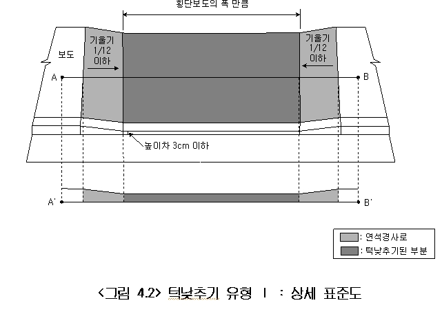 도로의 구조․시설 기준에 관한 규칙 제 16조 ②에 따르면 차도에 접하여 연석을 설치하는 경우 그 높이는 25cm 이하로 규정되어 있으나, 이러한 높이차는 휠체어사용자나 유모차 이용자 등의 통행에 지장을 주므로, 횡단보도와 같은 특정부분에서는 연석의 높이를 낮추는 것이 필요하다.