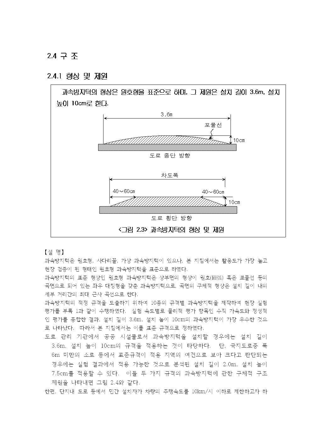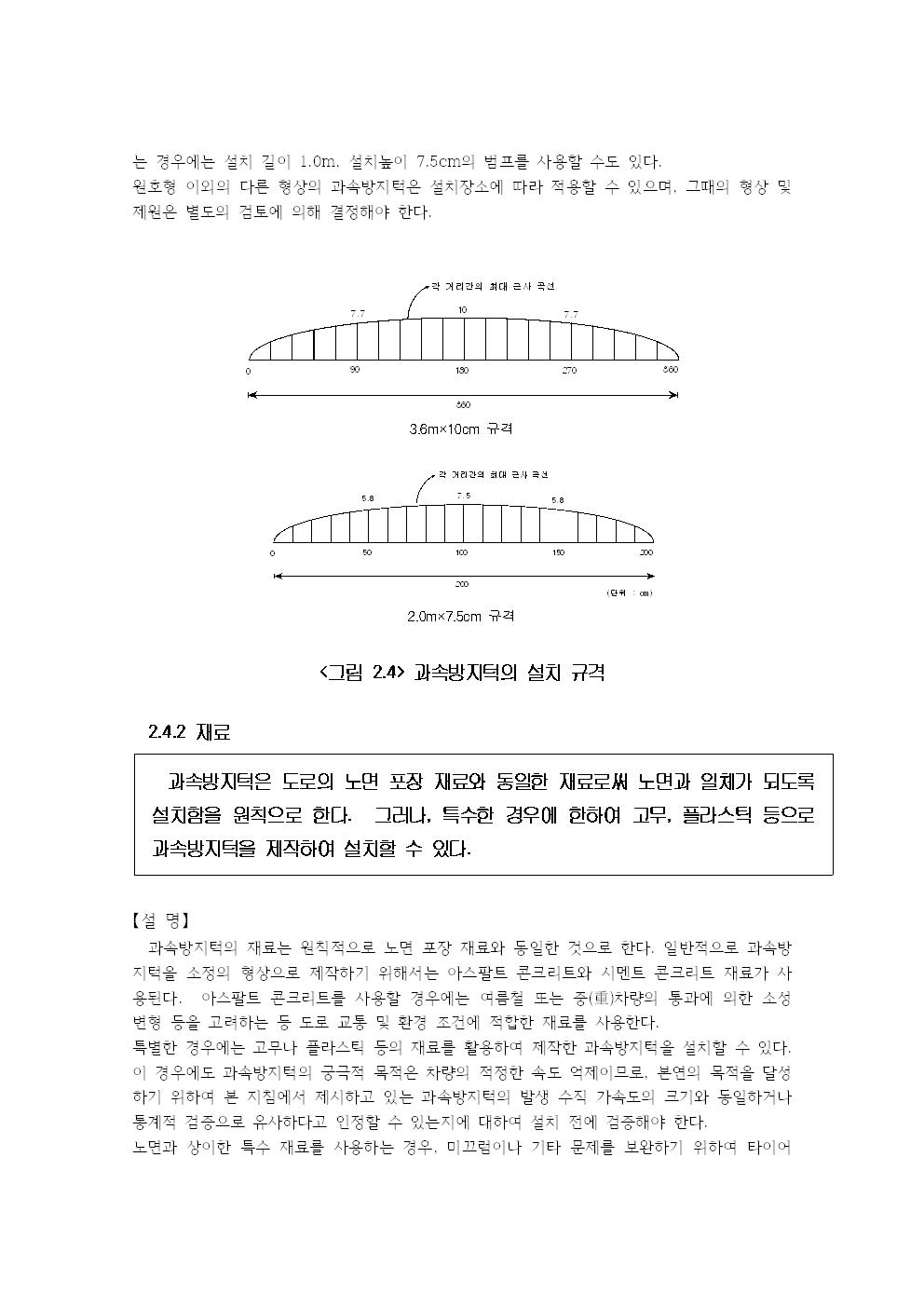 과속방지턱의 형상은 원호형을 표준으로 하며, 그 제원은 설치 길이 3.6m, 설치 높이 10cm로 한다.