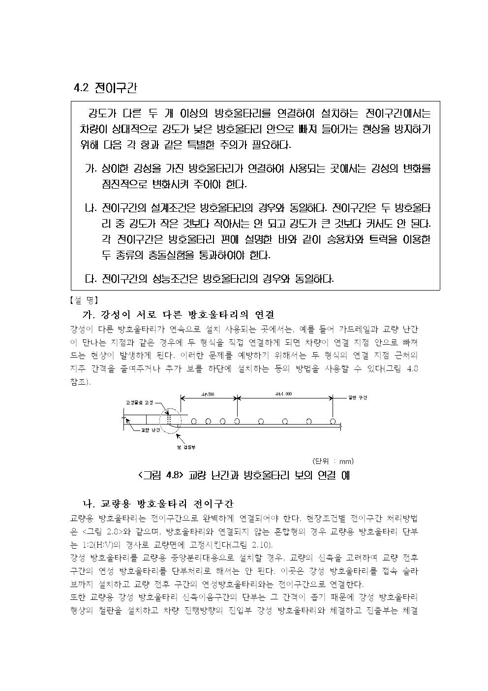 나. 전이구간의 설계조건은 방호울타리의 경우와 동일하다. 전이구간은 두 방호울타리 중 강도가 작은 것보다 작아서는 안 되고 강도가 큰 것보다 커서도 안 된다. 각 전이구간은 방호울타리 편에 설명한 바와 같이 승용차와 트럭을 이용한 두 종류의 충돌실험을 통과하여야 한다.