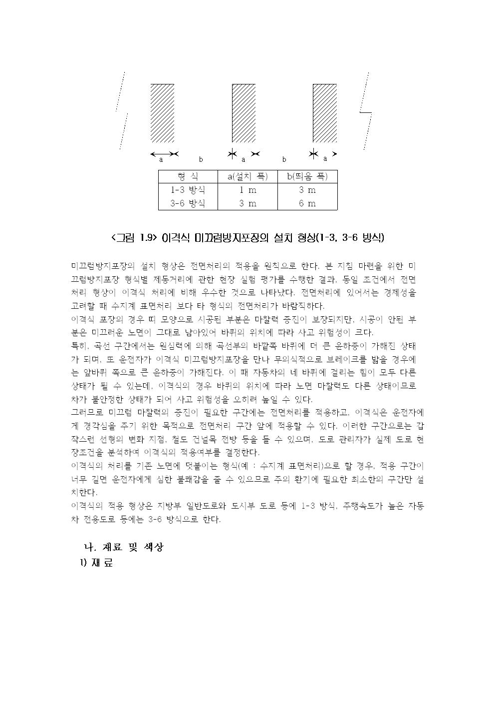가. 미끄럼방지포장의 설치 형상은 해당 구간의 노면 전체를 처리하는 전면처리와 일정 간격을 띄워 부분처리하는 이격식으로 구분되며, 이격식은 1-3 방식, 3-6 방식으로 나누어진다.