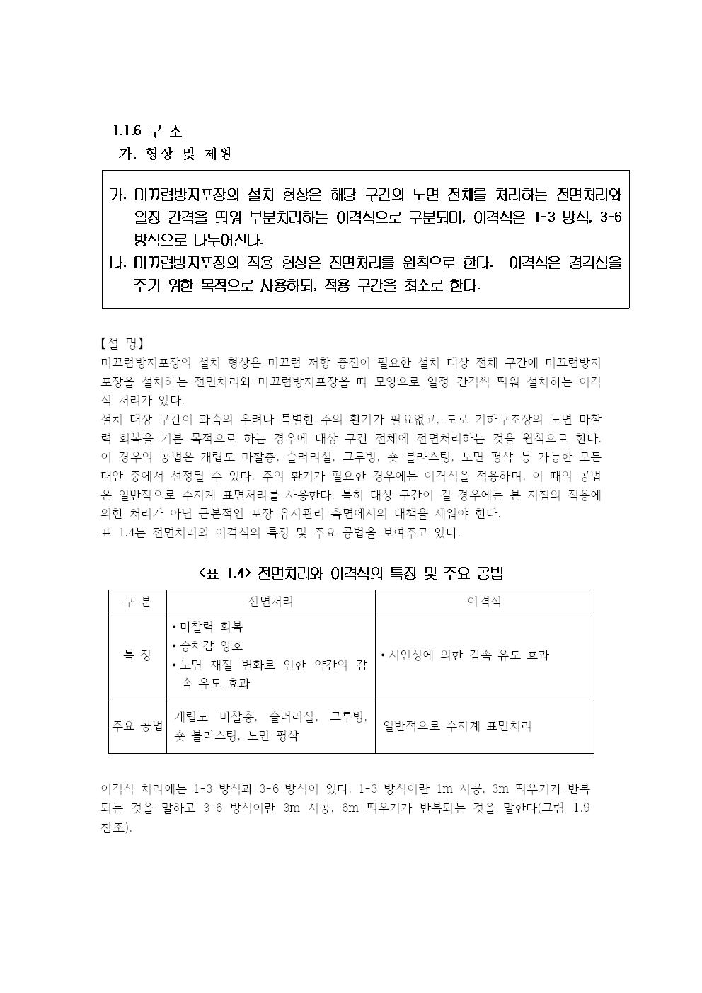 나. 미끄럼방지포장의 적용 형상은 전면처리를 원칙으로 한다. 이격식은 경각심을 주기 위한 목적으로 사용하되, 적용 구간을 최소로 한다.