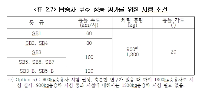 차량 방호울타리는 충돌 차량의 이탈을 방지하기 위한 구조적 강도와 탑승자의 안전성을 동시에 만족시켜야 하며, 적용도로의 등급, 교통량, 설계속도 별로 각각의 설계조건(충격도)을 갖는다.