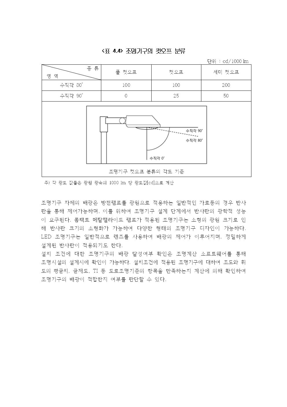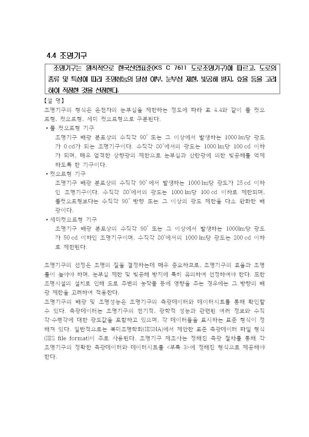 조명기구는 원칙적으로 한국산업표준(KS C 7611 도로조명기구)에 따르고, 도로의 종류 및 특성에 따라 조명성능의 달성 여부, 눈부심 제한, 빛공해 방지, 효율 등을 고려하여 적정한 것을 선정한다.